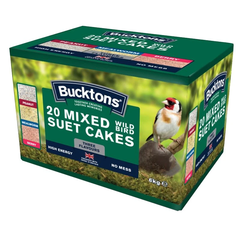 Bucktons Wild Suet Cakes are packed with high energy ingredients and come in three different flavours to help give wild birds the energy boost they need all year round. With the added advantages of being less messy, easier to handle and will not melt during the summer months. Each flavour is a high energy, no mess formulation for use in feeders, on bird tables or for ground feeding. Always ensure fresh water is available.