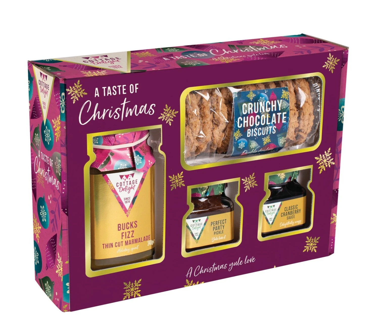 Cottage Delight A Taste of Christmas. Contains Thin Cut Marmalade, Perfect Party Pickle – with Carrot, Onion and Swede, Classic Cranberry Sauce, Crunchy Chocolate Biscuits & Bucks Fizz Thin Cut Marmalade – Orange & Marc de Champagne.
