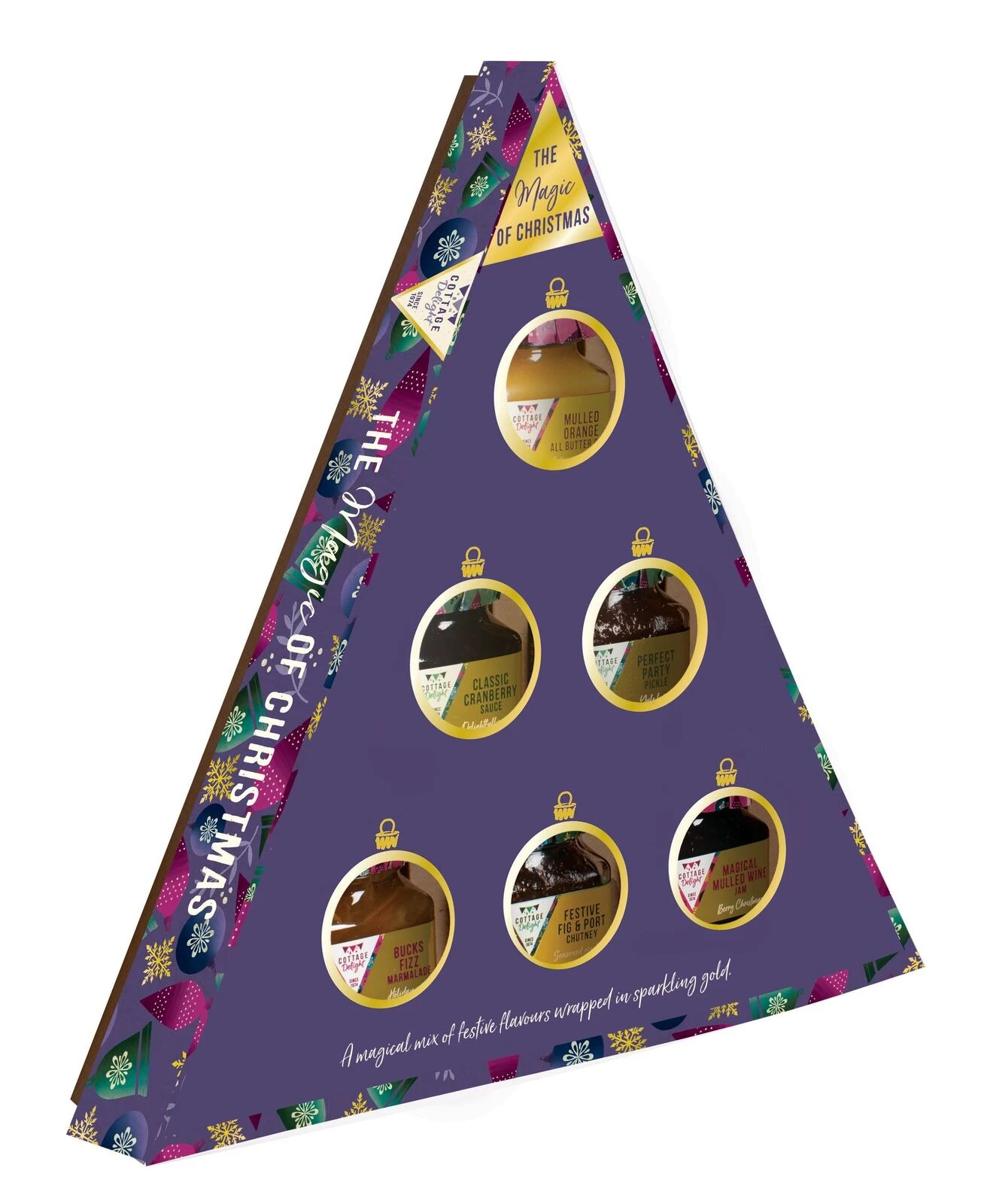 Cottage Delight The Magic of Christmas. Contains Blackcurrant Jam with Red Wine, Mulled Orange All Butter Curd, Festive Fig & Port Chutney, Bucks Fizz Thin Cut Marmalade – Orange & Marc de Champagne, Thin Cut Marmalade, Perfect Party Pickle – with Carrot, Onion and Swede & Classic Cranberry Sauce.