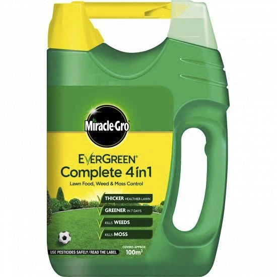 Miracle-Gro EverGreen Complete 4 in 1 feeds your lawn whilst also working to kill weeds and control moss. The WaterSmart? formula helps to protect against heat, drought and other stresses. Your lawn will be greener in 1 week, the moss will blacken and can then be easily raked out, and weeds will be killed within 3 to 5 weeks.