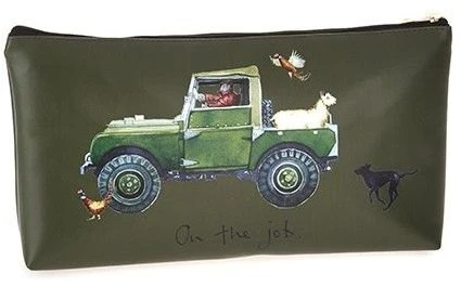 On the Job men’s wash bag, with farmer, Land Rover and farm animals.