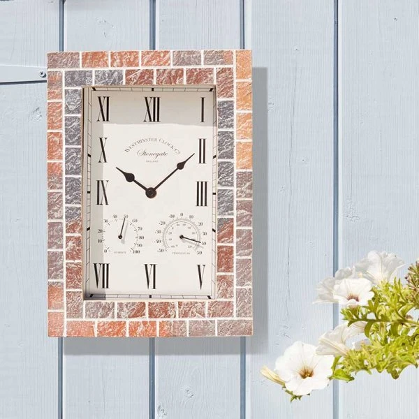 Suitable for outdoor or indoor use. Contemporary stone effect surround. Quartz accuracy. Centigrade & Fahrenheit. Humidity gauge included. Weather resistant. Requires one AA battery. 35 x 26 cm.