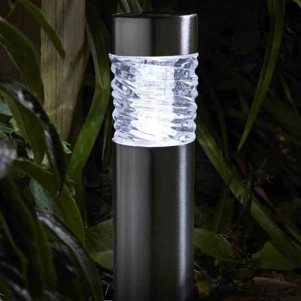 Attractive brushed stainless steel construction. Heavy duty glass optimises light dispersal. 10 Lumen Super Bright lighting. Simply push the spike into soft ground to place in position. Minimum operating time of 6+ hours. Charges in direct sunlight. Automatically illuminates at night. 56 x 7.5 cm.