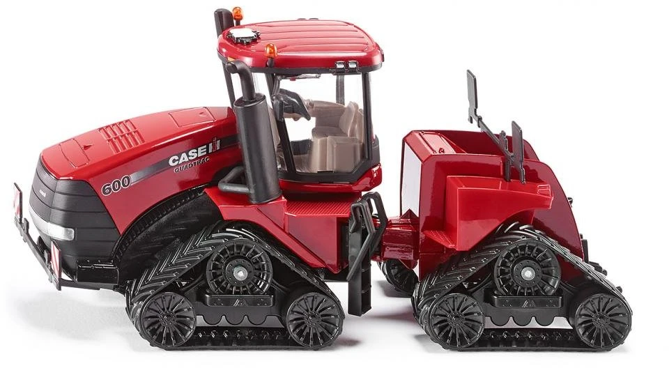 The Quadtrac 600 from the traditional CASE IH brand offers enormous pulling power and simultaneously evens out the pressure in the field. The brand-new 600 HP track tractor in this scraper tractor series premieres in SIKU?s range of powerful large tractors. Proven features like the SIKU rear coupling, universal lighting system on the cabin roof and folding mirrors are available as are a functional folding arm with levelling to keep the vehicle in its tracks on uneven terrain. The four triangular tracks run smoothly around the drive axles. Thanks to the high proportion of metal parts and carefully integrated details, the model is resilient to energetic play and withstands unscheduled interruptions to service. Warning plates at the front and rear alert other vehicles to the machine’s powerful dimensions.