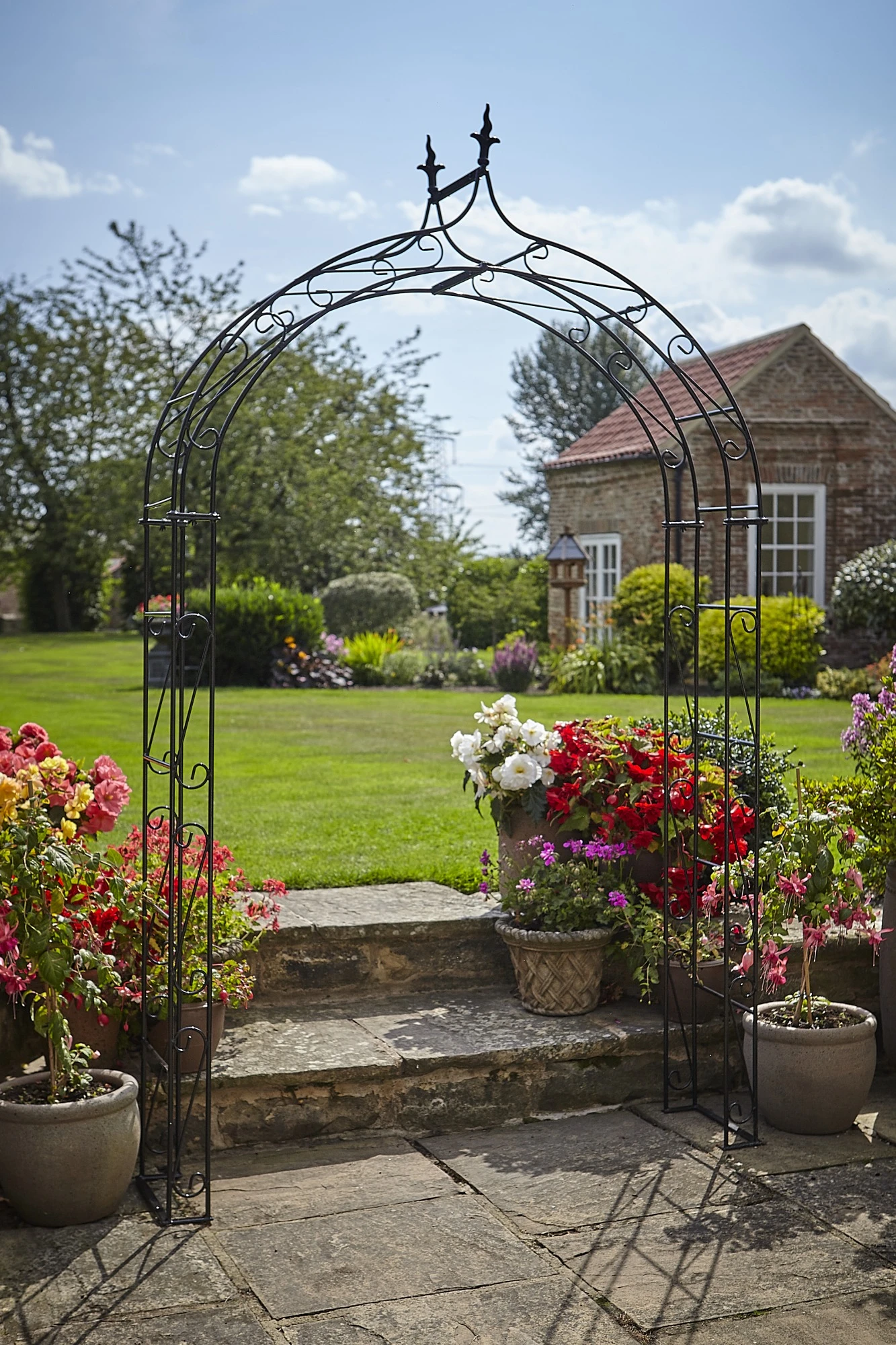 A handcrafted garden arch made from heavy duty steel and finished in traditional black. Features a scroll design and eye catching finails. The ideal way to frame an entrance and create a stunning feature in a garden.