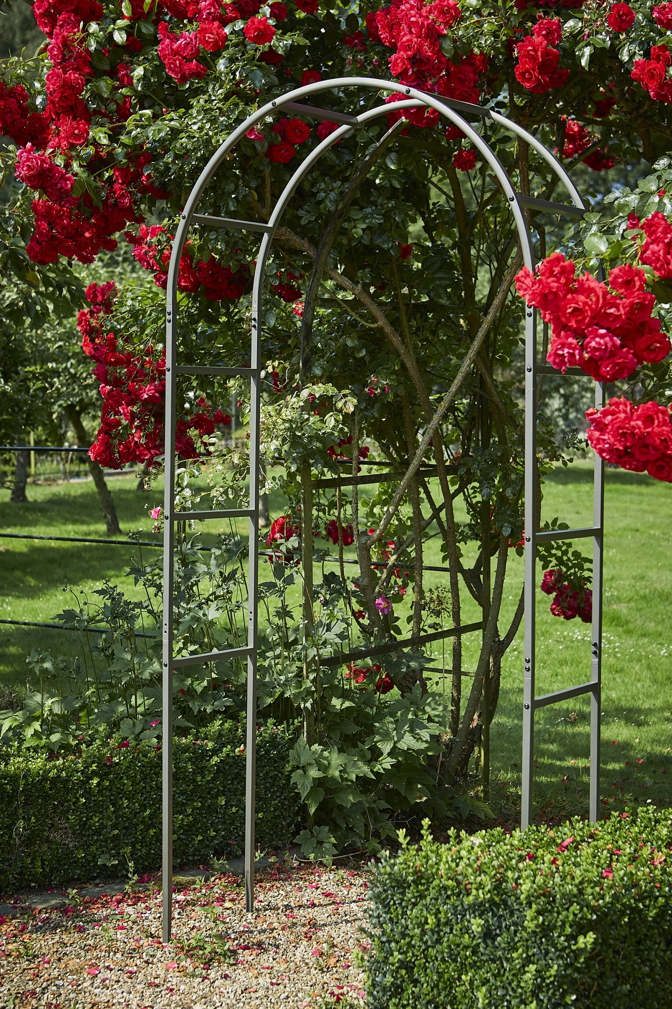 A traditional garden arch coated in a stylish new pewter finish. Perfect to create a fabulous focal point in a garden. The ideal framework for a variety of climbing plants. 110cm Width x 40cm Diameter x 228cm Height.