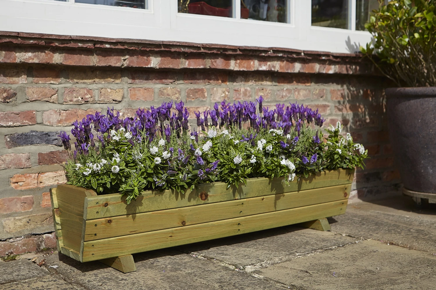 A charming wooden planter with rustic styling. Large enough for small shrubs or herbs. Brings colour to a garden or a patio.