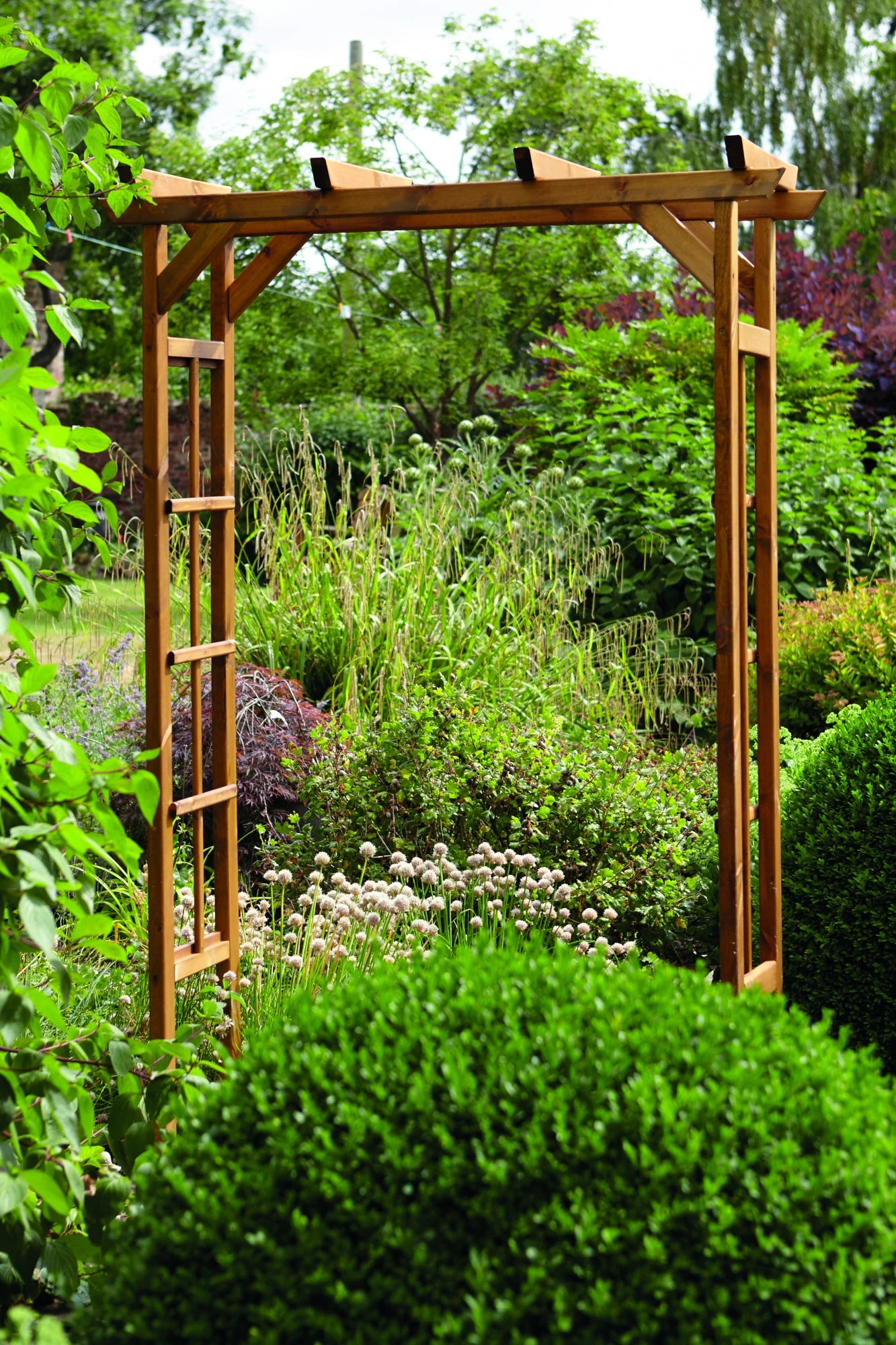 A rustic styled garden arch with lattice sides and detailed roof section. Creates a spectacular entrance to a garden. Can be used with climbing plants for a cotttage style feature.