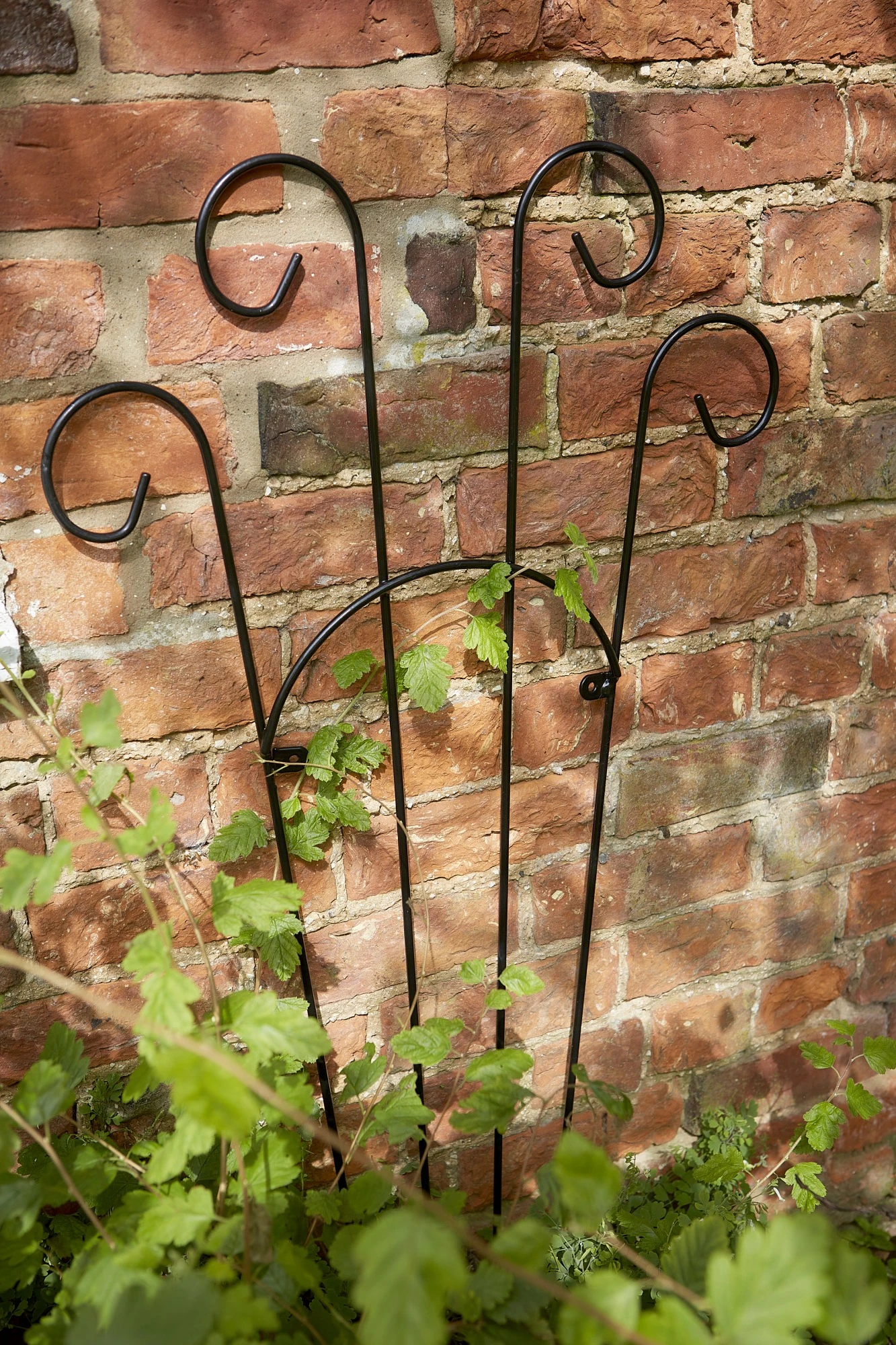 Traditional design with scroll uprights. Made from heavy duty steel and plastic coated in black. Use against a wall or in a large container.