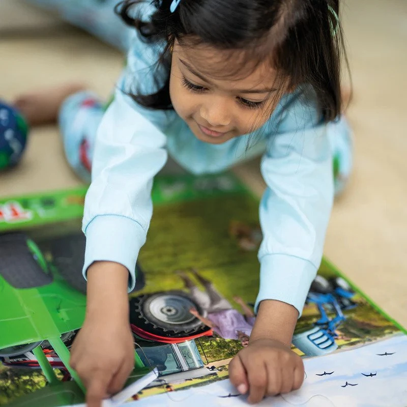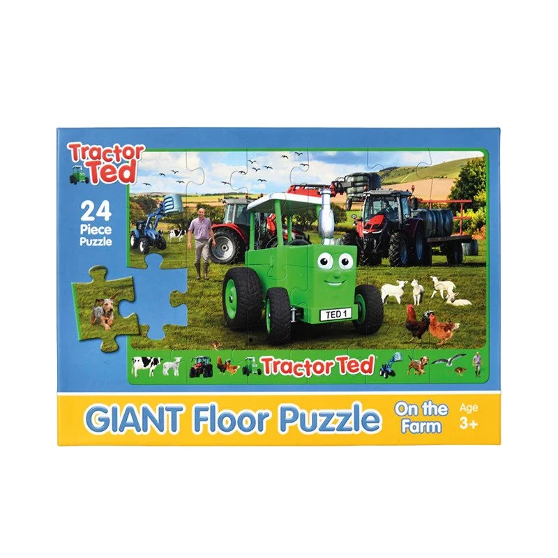 The Tractor Ted Giant Floor Puzzle features Tractor Ted busy on the farm with Midge the dog, Farmer Tom, plenty of machines and lots of farm animals. When the puzzle is completed for extra fun and learning use the banner to find everything in the picture.