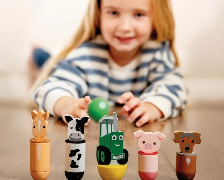 The tractor Ted Wooden Farm Skittles are sure to be Tedtastic fun for both indoor and outdoor play. Line the skittles up and roll the ball to knock them down and see who wins. Crafted from sturdy wood and featuring Tractor Ted, Midge the dog and their farmyard friends.